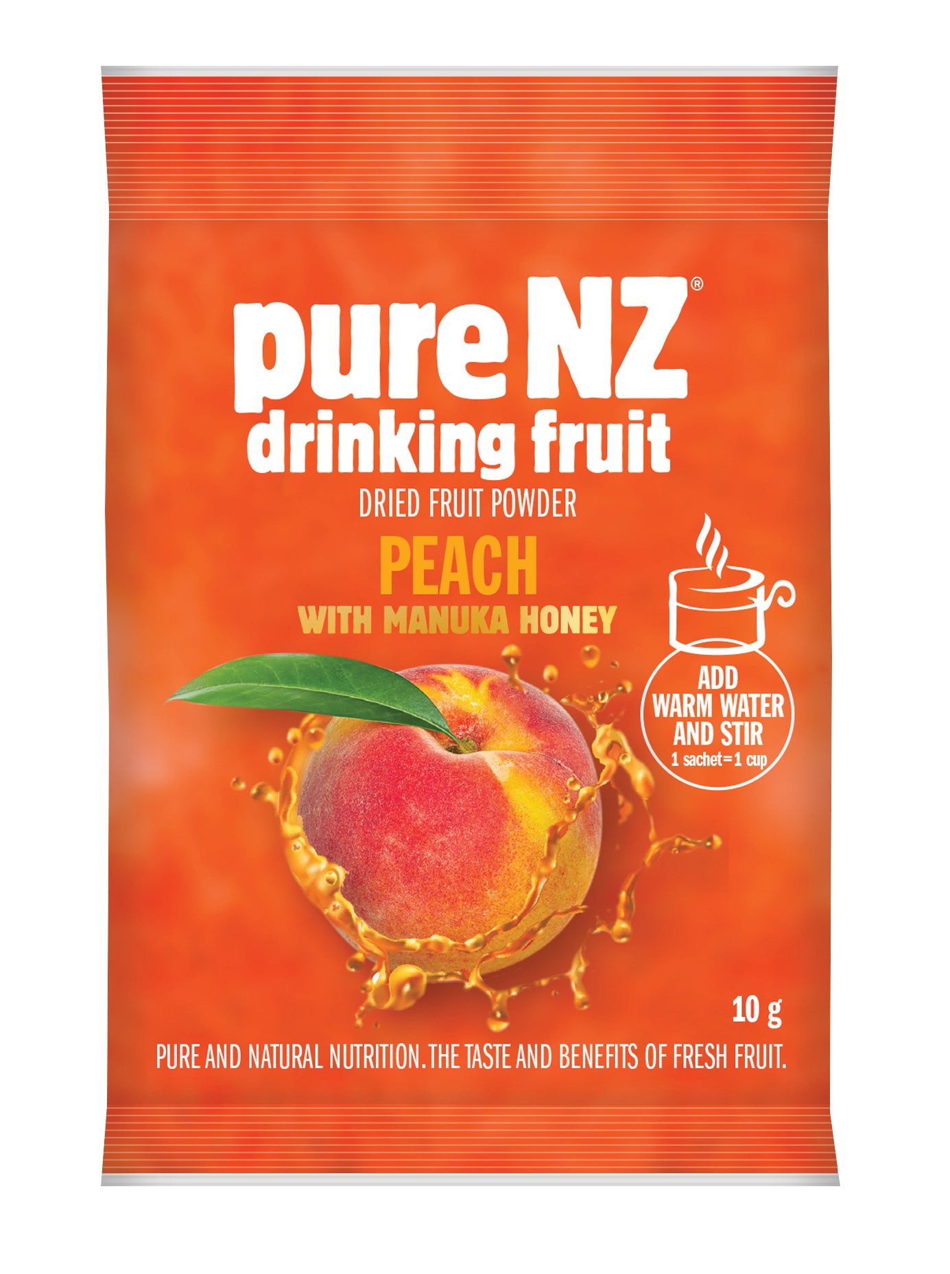 Just add warm water, stir and enjoy… anytime, anywhere. Pure and natural drinking fruit powder with Manuka Honey. 10g sachet each of peach and honey.